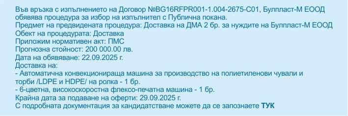 Във връзка с изпълнението на Договор №BG16RFPR001-1.004-2675-C01, Булпласт-М ЕООД обявява процедура за избор на изпълнител с Публична покана. Предмет на предвидената процедура: Доставка на ДМА 2 бр. за нуждите на Булпласт-М ЕООД Обект на процедурата: Доставка Приложим нормативен акт: ПМС Прогнозна стойност: 200 000.00 лв. (102 258,38 €) Дата на обявяване: 22.09.2025 г. Доставка на: - Автоматична конвекционираща машина за производство на полиетиленови чували и торби /LDPE и HDPE/ на ролка - 1 бр. - 6-цветна, високоскоростна флексо-печатна машина - 1 бр. Крайна дата за подаване на оферти: 29.09.2025 г.